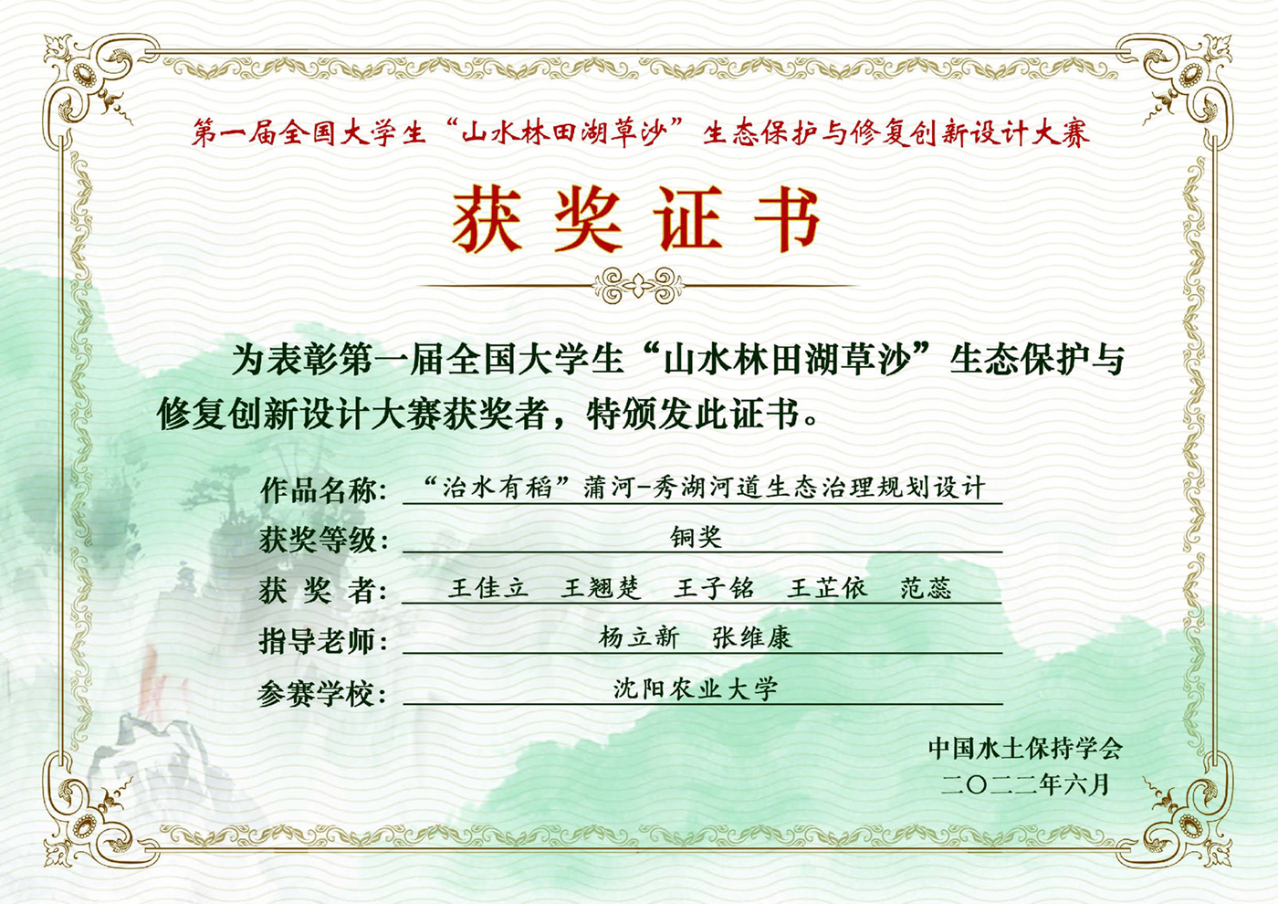 近日,在首届全国大学生“山水林田湖草沙”生态保护与修复创新设计大赛决赛中,华体会足球_华体会(中国)官网风景园林学科教师杨立新、张维康指导研究生王佳立、王翘楚、王子铭、王芷依、范蕊完成的作品斩获铜奖。