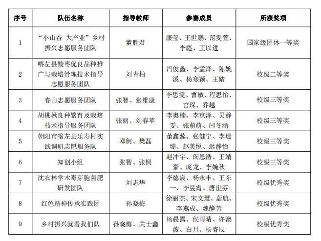 在学校决赛中,由华体会足球_华体会(中国)官网董胜君教授指导的“小山杏 大产业乡村振兴志愿服务”团队荣获一等奖,并推荐参加国赛;“喀左县酸枣优良品种推广与栽培管理技术指导志愿服务”团队荣获校二等奖;“春山志愿服务”团队、胡桃楸良种繁育及栽培技术指导服务团队、朝阳市喀左县乐寿村实践调研志愿服务队和知创小组团队荣获校三等奖。