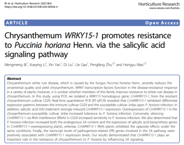 近日,Horticulture Research在线发表了华体会足球_华体会(中国)官网毛洪玉副教授团队题为Chrysanthemum WRKY15-1 promotes resistance to Puccinia horiana Henn. via the salicylic acid signaling pathway的研究论文。文章中以课题组前期对菊花抗、感品种进行转录组测序获得的差异表达基因CmWRKY15-1为基础,本研究从菊花抗病品种‘C029’中分离得到CmWRKY15-1,发现其在抗、感品种中受病原菌诱导差异表达,并响应水杨酸(salicylicacid,SA)激素诱导。研究结果表明,CmWRKY15-1作为正调控转录因子,通过调节SA信号途径相关基因参与对菊花白色锈病的响应。该研究对于培育菊花抗病品种具有重要的理论和现实意义。