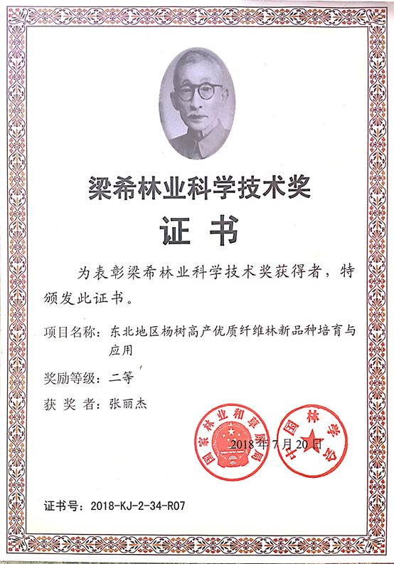 近日获悉,由华体会足球_华体会(中国)官网张丽杰副教授参加的项目“东北地区杨树高产优质纤维林新品种培育与应用”和“东北核桃楸选育及资源利用研究”分别获梁希林业科学技术二等奖和吉林省政府科技进步二等奖。
