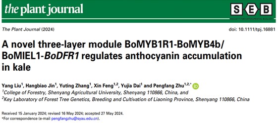 近日,植物科学领域顶级期刊The Plant Journal在线发表了沈阳农业大学祝朋芳教授团队题为《A novel three-layer module BoMYB1R1-BoMYB4b/BoMIEL1-BoDFR1 regulates anthocyanin accumulation in kale》的研究论文,揭示了BoMYB1R1-BoMYB4b/BoMIEL1-BoDFR1级联模块响应光信号调控羽衣甘蓝花青素生物合成的新机制。