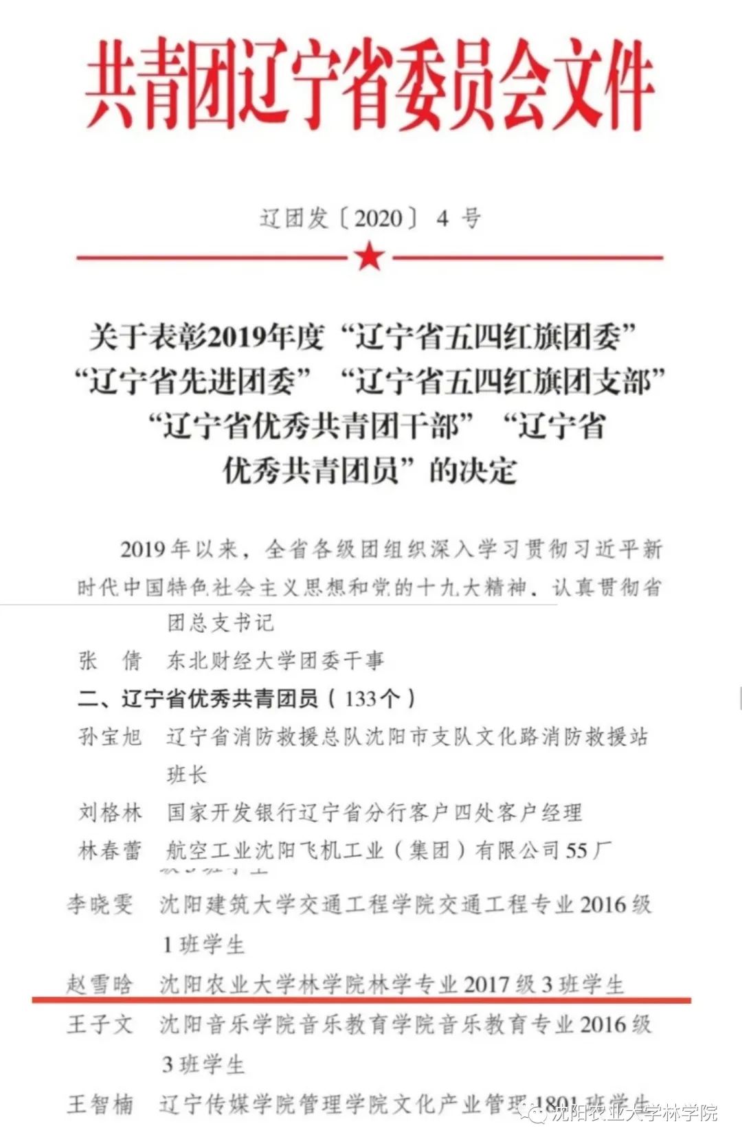 近日辽宁省共青团下发的《关于表彰 2019年度“辽宁省五四红旗团委”“辽宁省先进团委”“辽宁省五四红旗团支部”“辽宁省优秀共青团干部”和“辽宁省优秀共青团员”的决定》文件中,我院2017级林学专业赵雪晗同学被评为“辽宁省优秀共青团员”