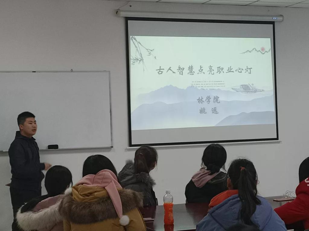 首先,古人也有就业难。姚老师介绍:相比较于我们,古人的就业面较窄,一般分为三种:入仕,经商,务农。寻找工作的途径单一难度大,并向我们展示了四个名人的职业经历:挖空心思,考国家公务员——李白;世界那么大,穷游去看看——徐霞客;落榜码字,逆袭成作家——蒲松龄;自主创业,富甲一方 ——沈万三。其次,以诸葛亮为例向我们介绍了如何成为成功的求职人,并以此为例,分析我们在考虑自己今后的职业规划时,可以注意以下几个方面:一、明确自己想要成为怎样的人;二、在竞争激烈的时代立足并脱颖而出;三、了解自己的长处是否对职业有帮助;四、是否有能拿得出手的作品;五、坚定不移,矢志不渝。