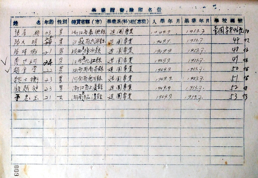 【注】复旦大学农学院园艺系1950年成立“观赏组”,学生来源于园艺系园艺专业一二年级,其中1949级18人、1950级2人。1952年,观赏组随复旦大学农学院调整至我校。1953年,我校观赏组首届学生毕业,颁发“造园专业”本科文凭。